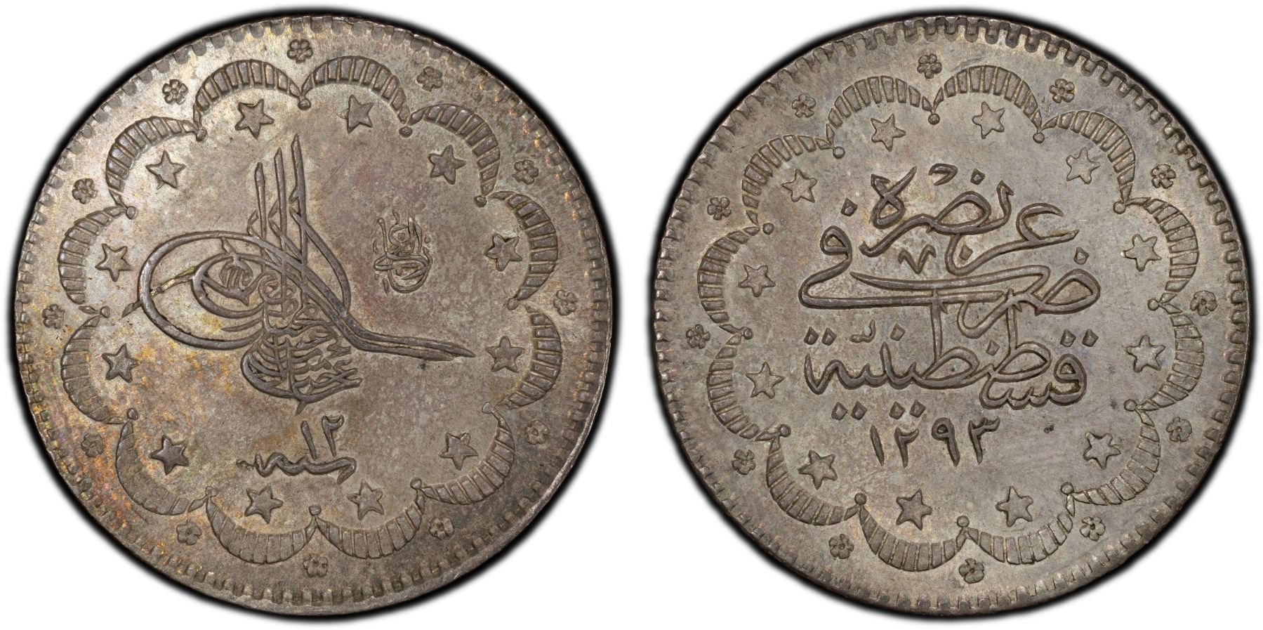 TURKEY: Abdul Hamid II, 1876-1909, AR 5 kurush, Kostantiniye, AH1293 year 12, PCGS MS64