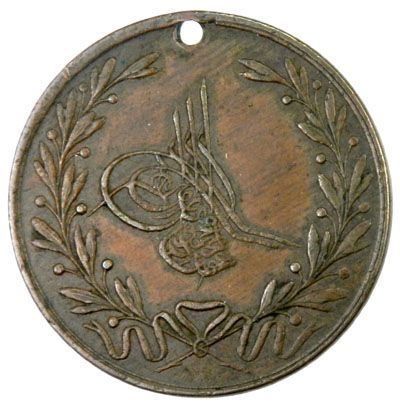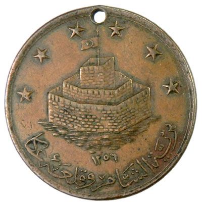 TURKEY: Abdul Mejid, 1839-1861, AE medal (13.37g), AH1256, Haffner-AM-1, 29.9mm, toughra above wreath / citadel of Acre, the Turkish flag flying above, date 1256 below, pierced for suspension, VF to EF. Struck in commemoration of the victory of the Damascus Eyalet infantry of the Ottoman Army over the British forces attacking the citadel in Acre.