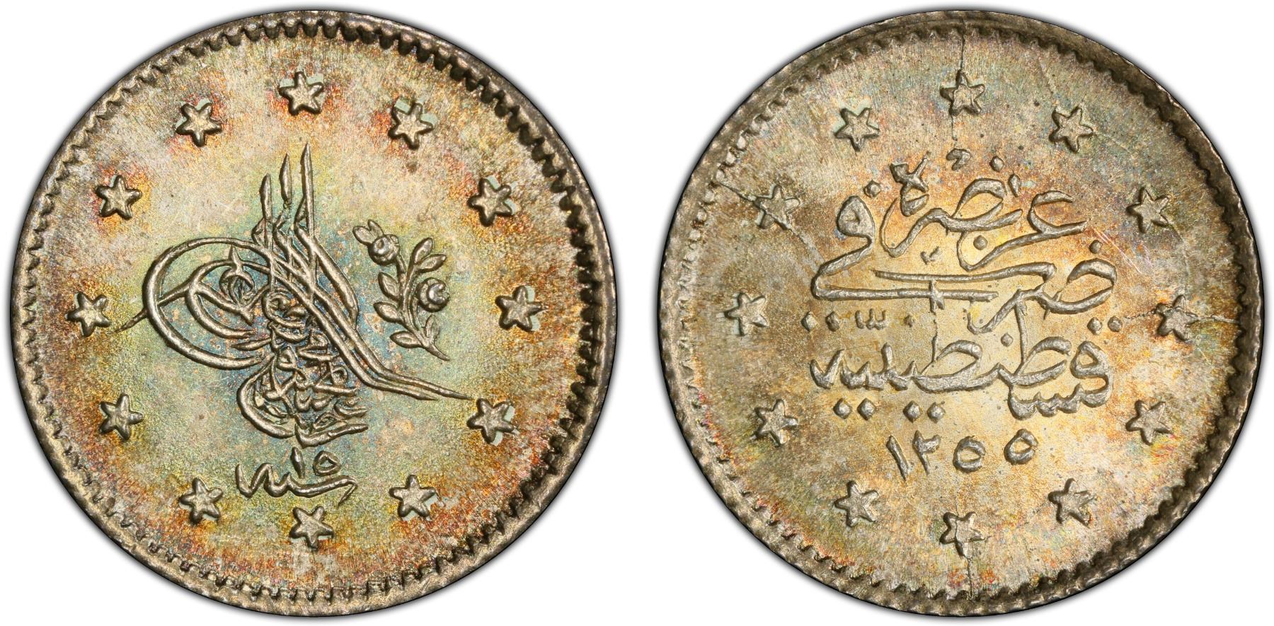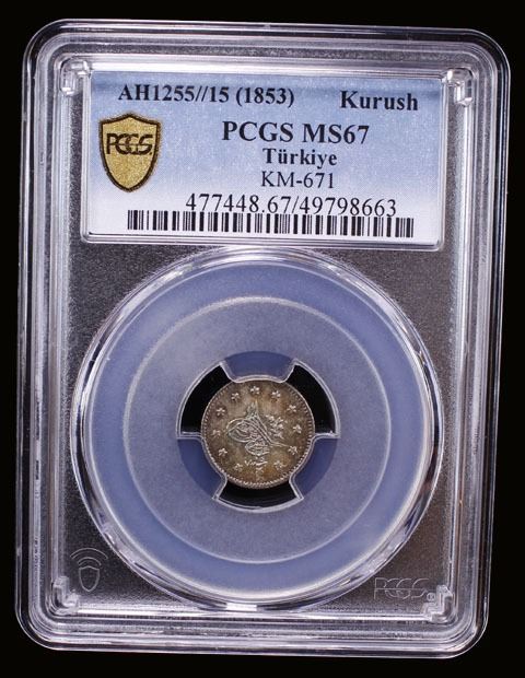 TURKEY: Abdul Mejid, 1839-1861, AR kurush, Kostantiniye, AH1255 year 15 (1853), KM-671, a stunning reflective mint state example! PCGS graded MS67. Part of a small group of 15 coins of this accessional date and regnal year purchased by Maj. Fred S. Pridmore in Cyprus in the 1960s.
