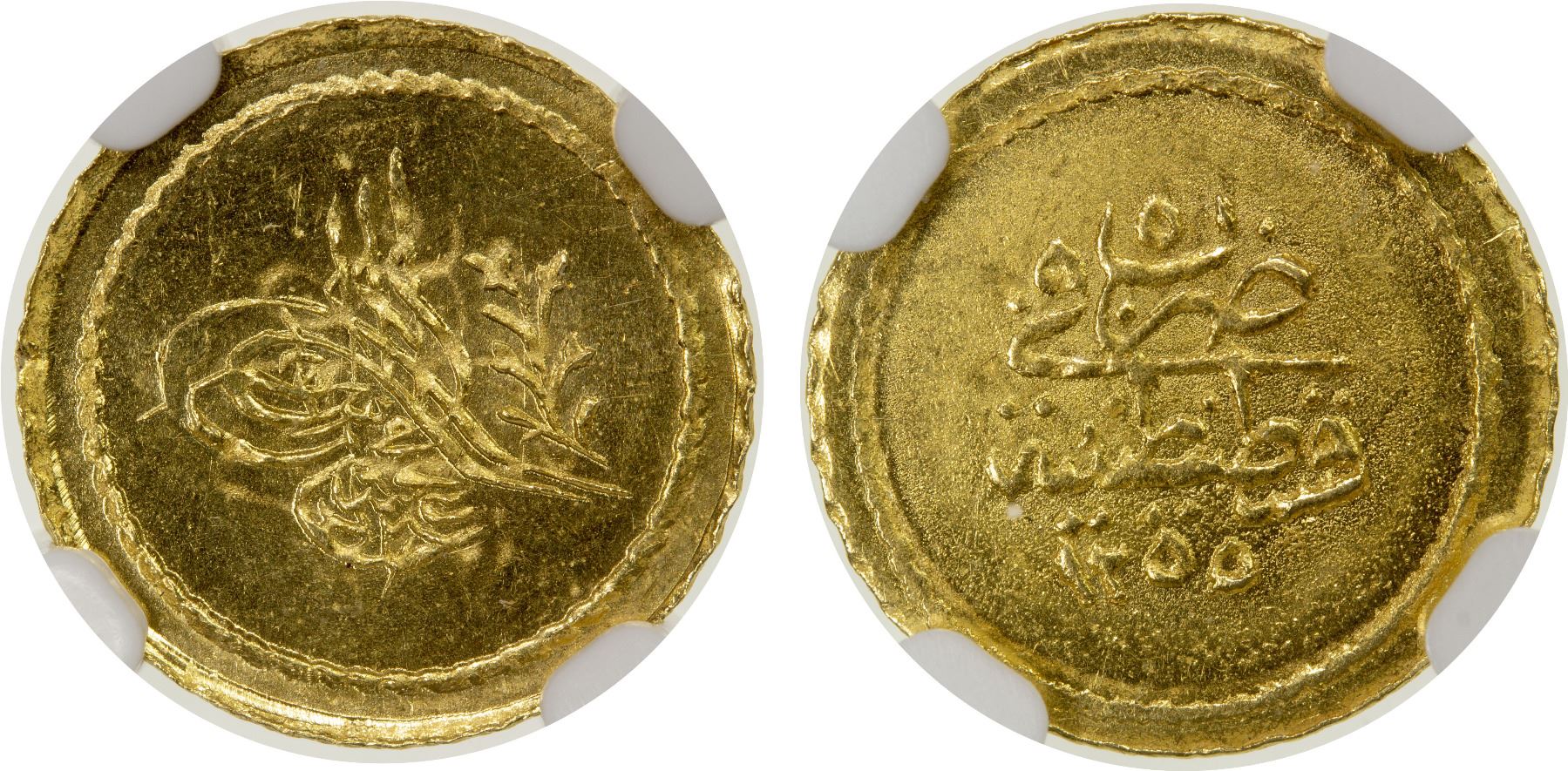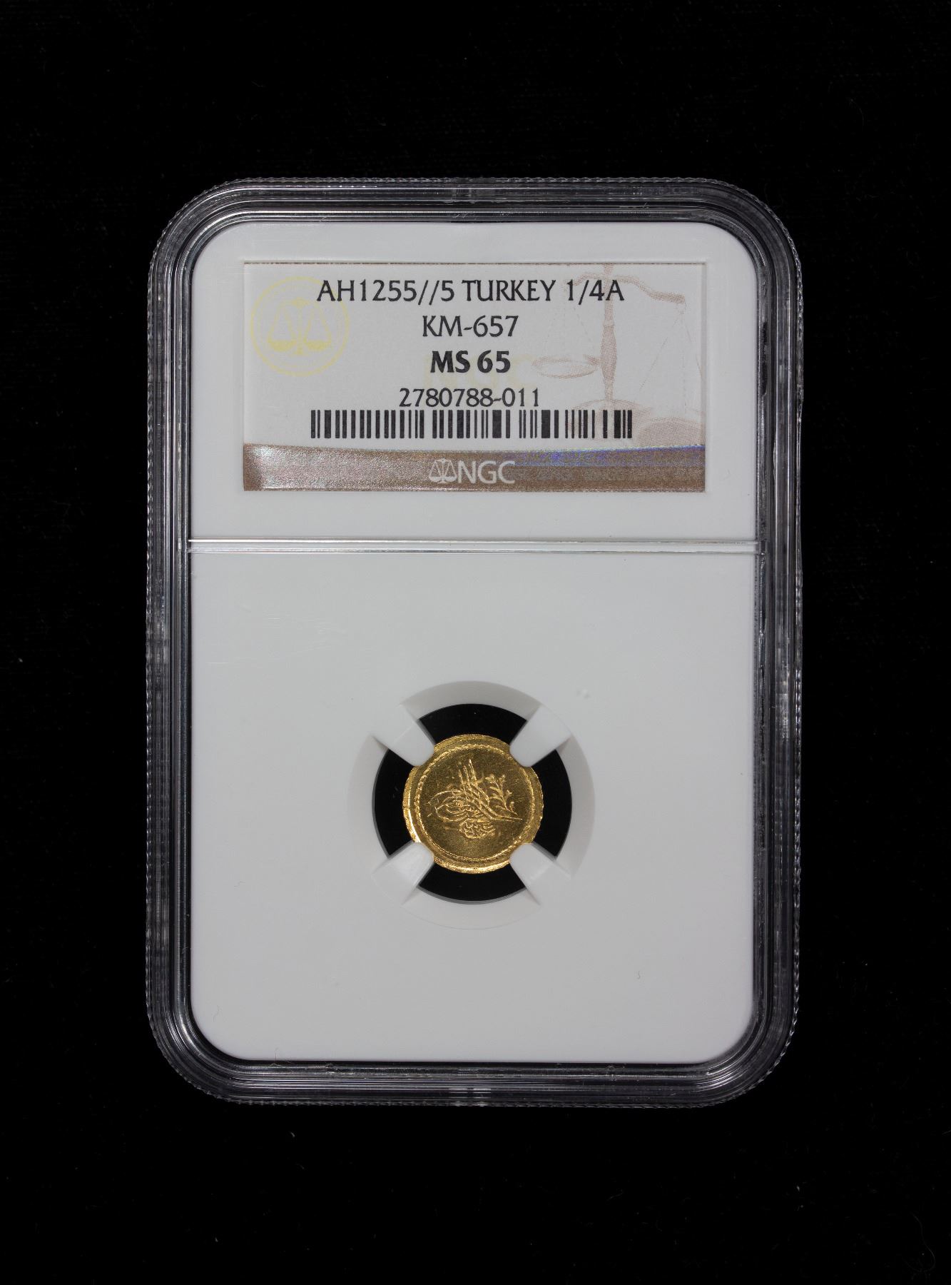 TURKEY: Abdul Mejid, 1839-1861, AV 1/4 mehmudiye, Kostantiniye, AH1255 year 5, KM-657, last year of the preform coinage, glorious luster, especially on the obverse! NGC graded MS65, ex Choudhury Collection.