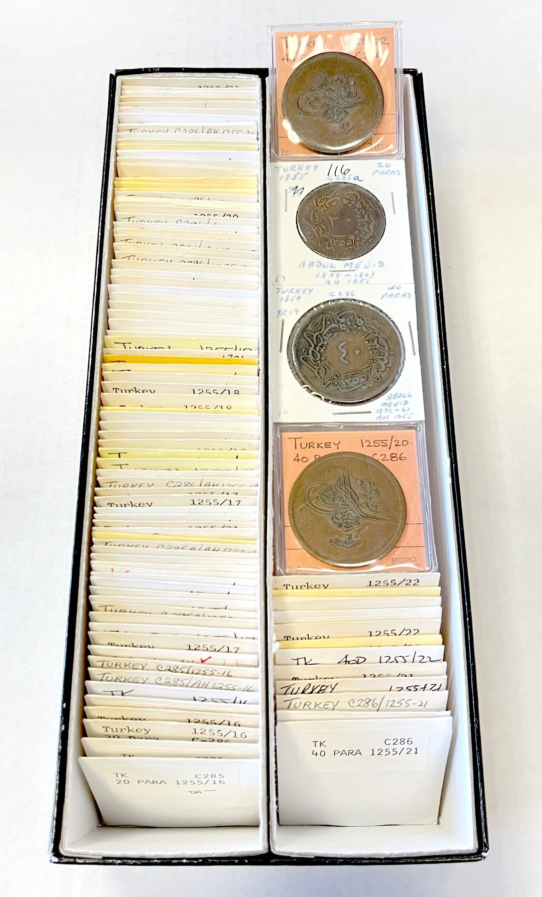 TURKEY: Abdul Mejid, 1839-1861, LOT of 97 bronze coins of Abdul Mejid: 20 para:AH1255/16 KM-668.1 (10 pcs), AH1255/17 (2), AH1255/20 KM-668.2 (6), AH1255/21 (10); 40 para: AH1255/17 KM-670 (6), AH1255/18 (13), AH1255/19 (15), AH1255/20 (15), AH1255/21 (12), AH1255/22 (2/1 overdate, 1), AH1255/22 (7, S); average circulated grades or better, including 3 ex-Pridmore pieces, in consignor 's 2x2 envelopes, retail value $1100, lot of 97 pieces.