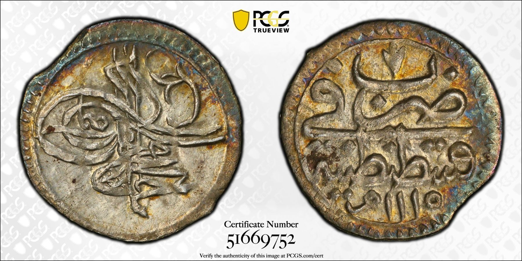 TURKEY: Ahmed III, 1703-1730, AR akçe, Kostantiniye, AH1115, KM-135, mint master initials min re, a pleasing mint state example, PCGS graded MS62.