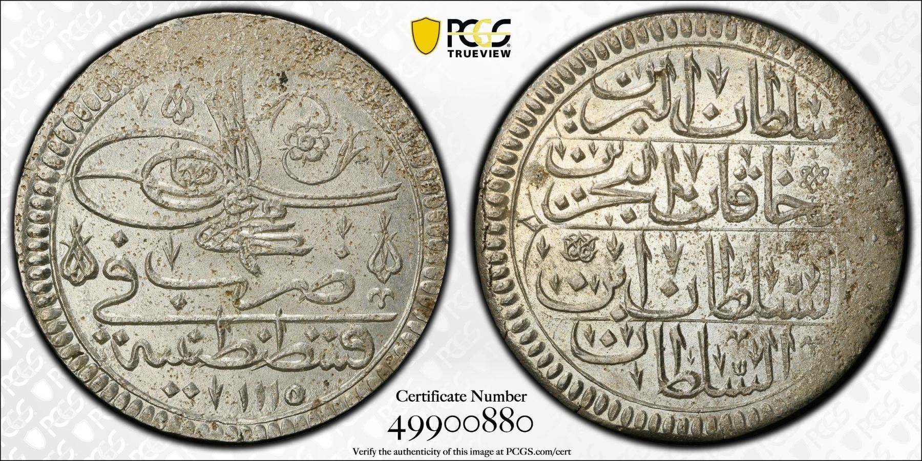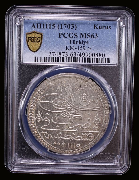 TURKEY: Ahmed III, 1703-1730, AR kurush, Kostantiniye, AH1115 (1703), KM-159, mint master initials min dal, a lovely lustrous mint state example! PCGS graded MS63.