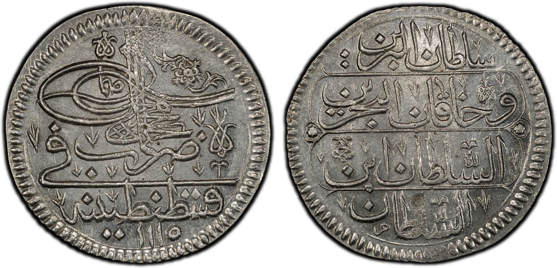 TURKEY: Ahmed III, 1703-1730, AR yirmilik, Kostantiniye, AH1115, PCGS MS64