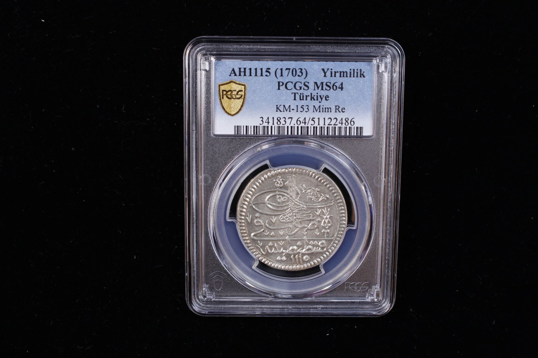 TURKEY: Ahmed III, 1703-1730, AR yirmilik, Kostantiniye, AH1115, KM-153, mint master initials ha, a wonderful lustrous mint state example! PCGS graded MS64.