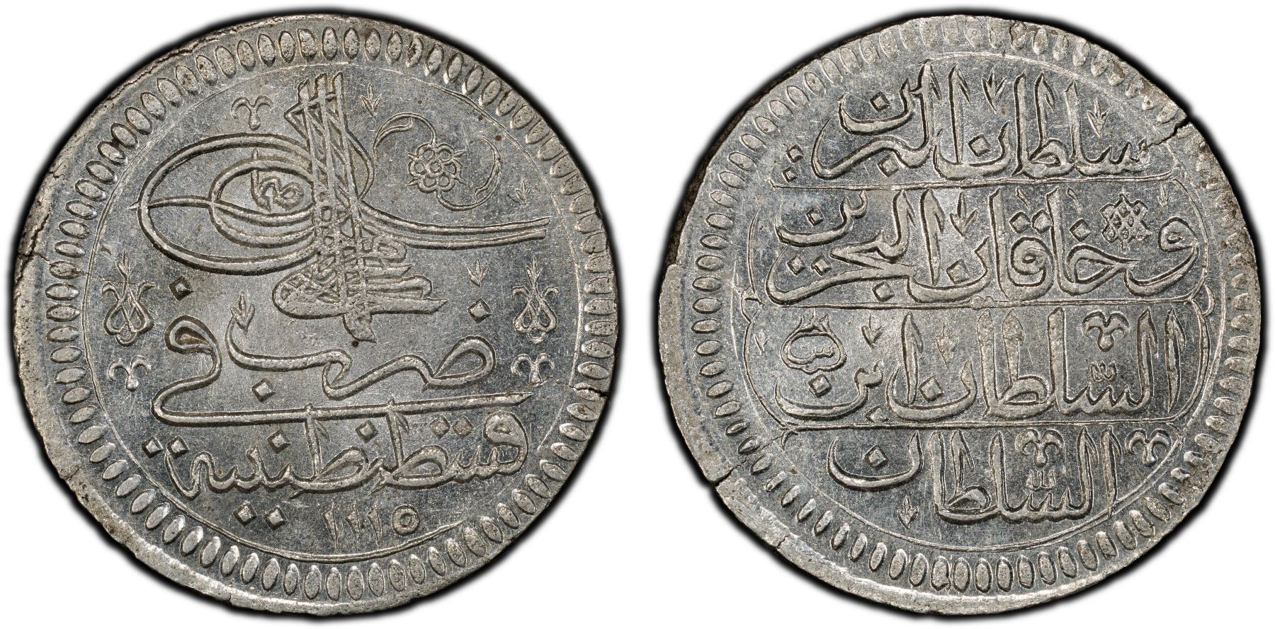 TURKEY: Ahmed III, 1703-1730, AR yirmilik, Kostantiniye, AH1115, KM-153, mint master initials mim dal, a superb lustrous mint state example! PCGS graded MS65.