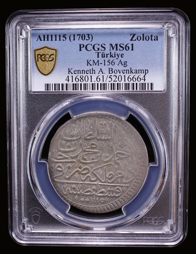 TURKEY: Ahmed III, 1703-1730, AR zolota, Kostantiniye, AH1106, KM-121.1, initial ('ayn), a pleasant mint state example, PCGS graded MS61, ex Kenneth A. Bovenkamp Collection.