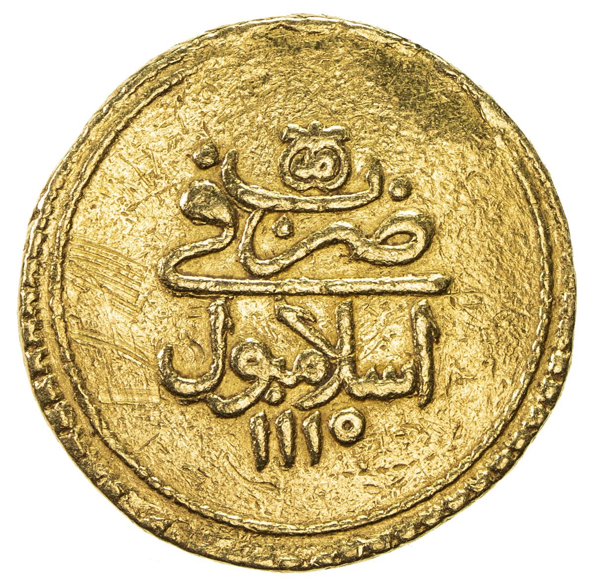 TURKEY: Ahmed III, 1703-1730, AV sultani (findik) (3.46g), Islambul, AH1115, KM-173, initial #36, couple very light scratches, possibly removed from jewelry (barely noticeable), VF, ex Ahmed Sultan Collection.