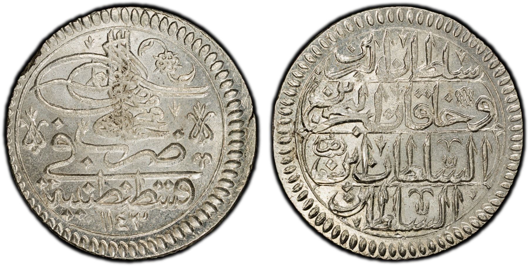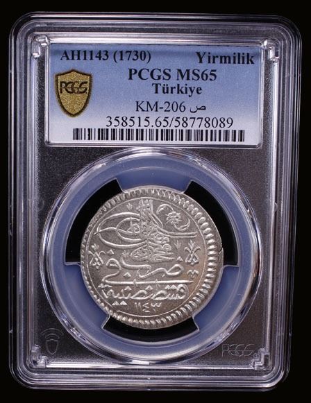 TURKEY: Mahmud I, 1730-1754, AR yirmilik (20 para), Kostantiniye, AH1143, KM-206, mintmaster initials sad, superb luster, rotated reverse, a gem example, PCGS graded MS65. Tied with one other example for highest graded (Top Pop) at PCGS.