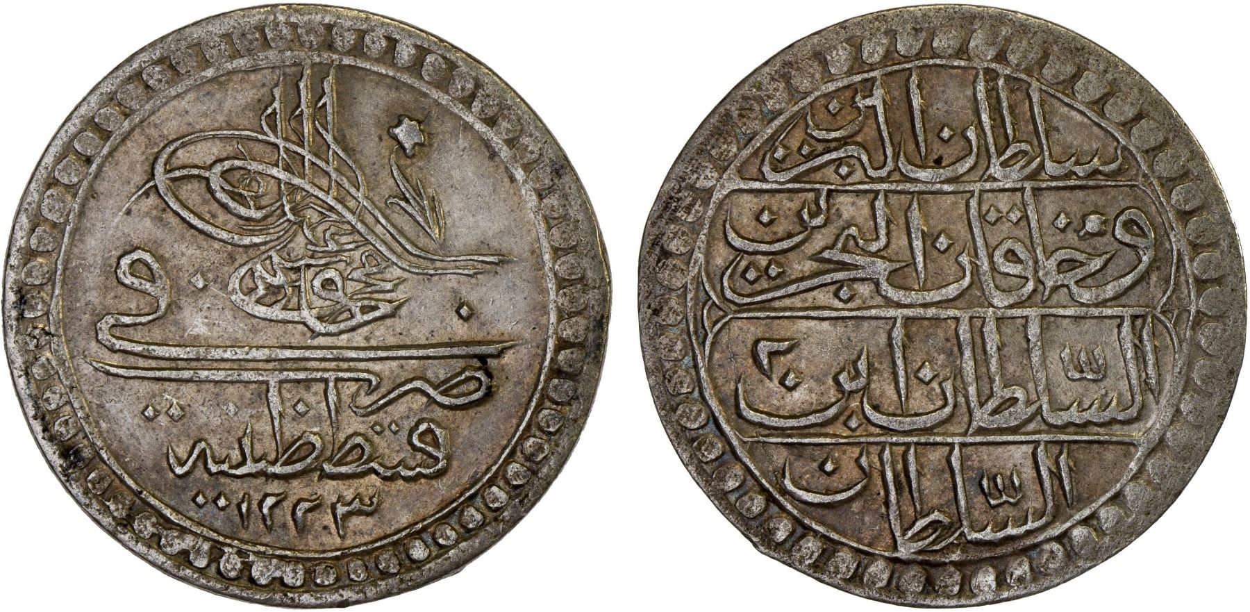 TURKEY: Mahmud II, 1808-1839, AR 10 para (2.99g), Kostantiniye, AH1223 year 2, KM-553, first series, struck only in regnal years 1 and 2, rarer for year 2, XF, R, ex Kenneth A. Bovenkamp Collection.