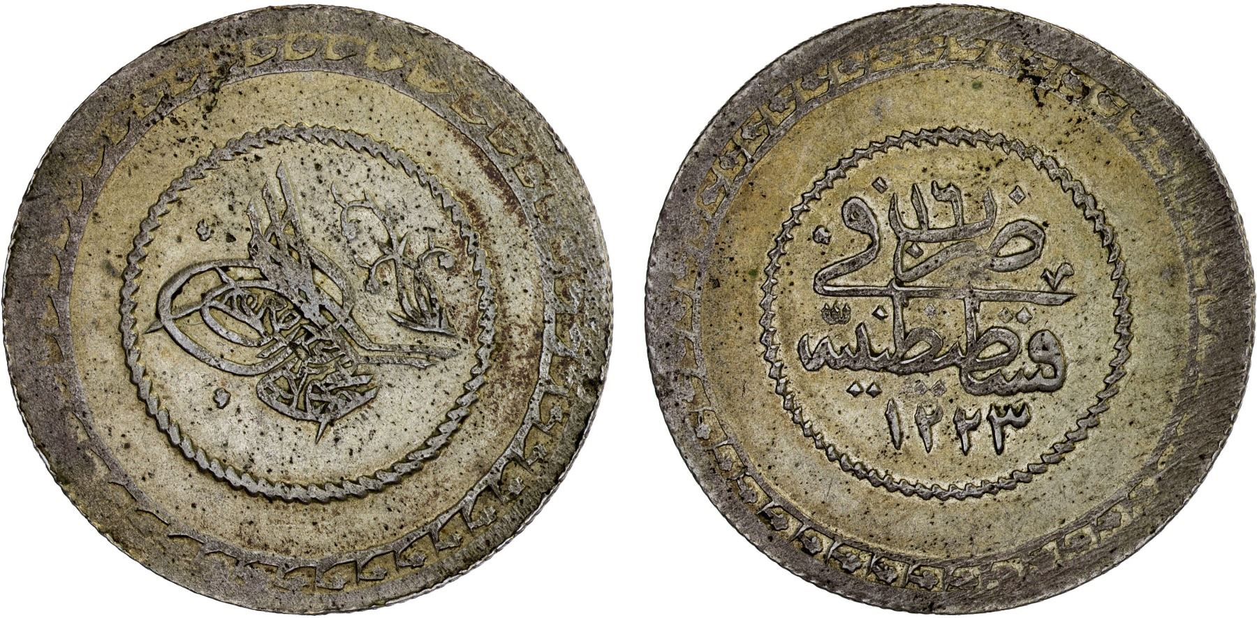TURKEY: Mahmud II, 1808-1839, AR 2 piastres (12.84g), Kostantiniye, AH1223 year 16, KM-576, fifth monetary standard; decent strike, XF, ex Kenneth A. Bovenkamp Collection.