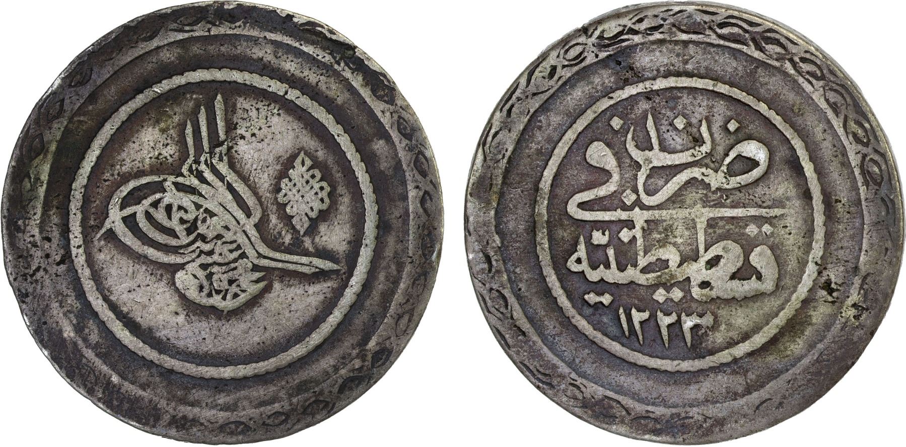 TURKEY: Mahmud II, 1808-1839, AR 5 piastres (23.60g), Kostantiniye, AH1223 year 10, KM-564, third monetary standard; evenly worn, scarce date, Fine, ex Kenneth A. Bovenkamp Collection.