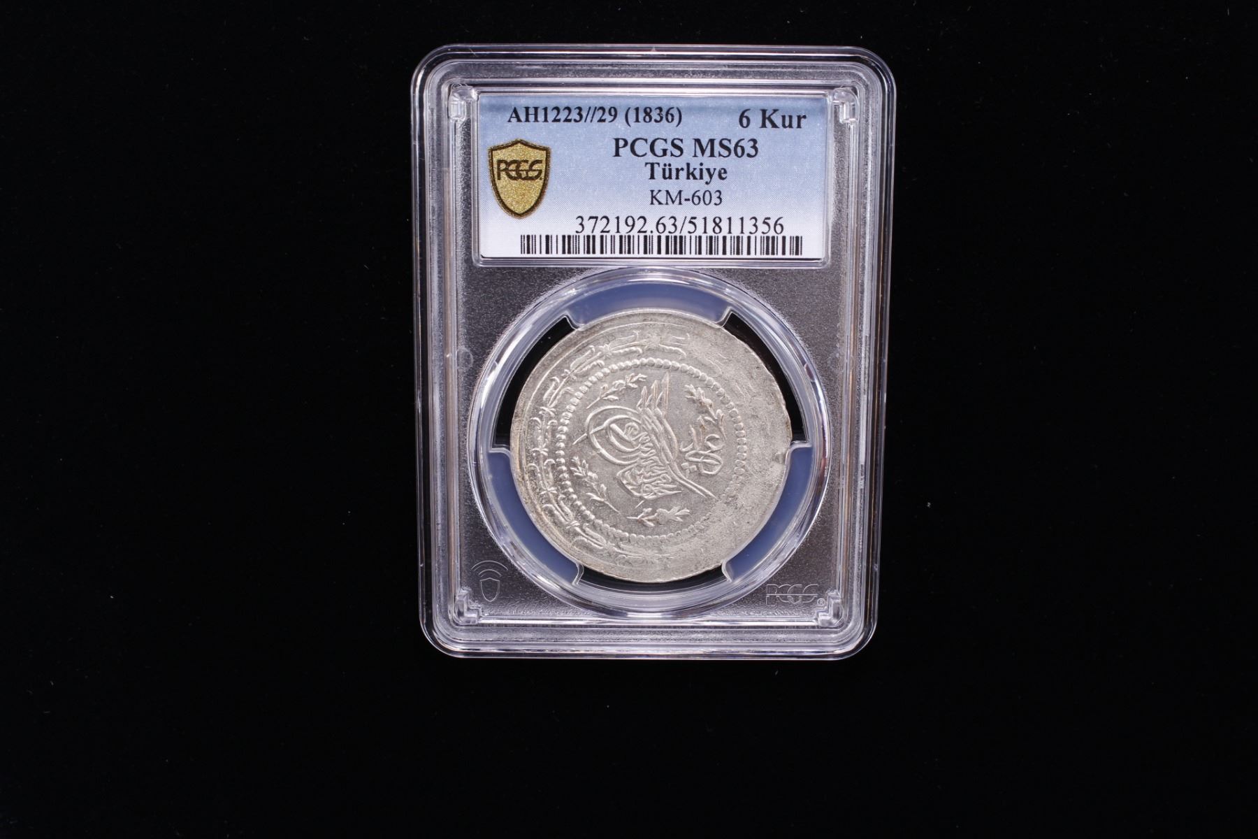 TURKEY: Mahmud II, 1808-1839, AR 6 kurush, Kostantiniye, AH1223 year 29, KM-603, a lovely example, PCGS graded MS63, ex Almer H. Orr III Collection.