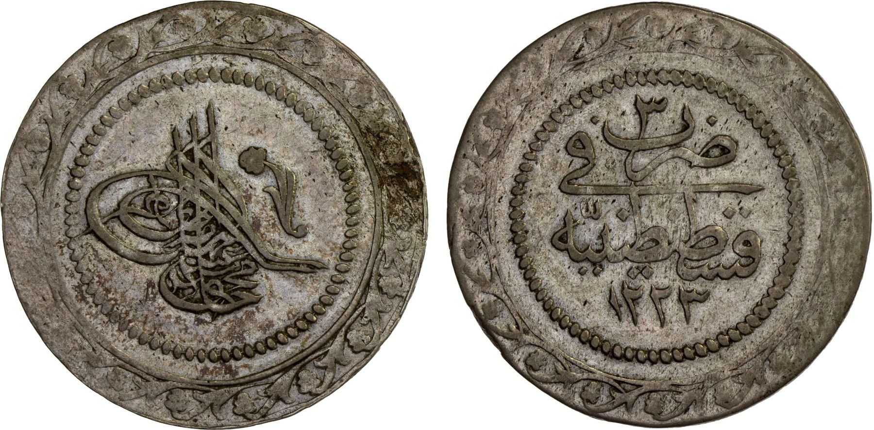 TURKEY: Mahmud II, 1808-1839, AR piastre (40 para) (4.97g), Kostantiniye, AH1223 year 3, KM-562, one year type, struck only in Mahmud's year 3, VF-XF, R, ex Kenneth A. Bovenkamp Collection.