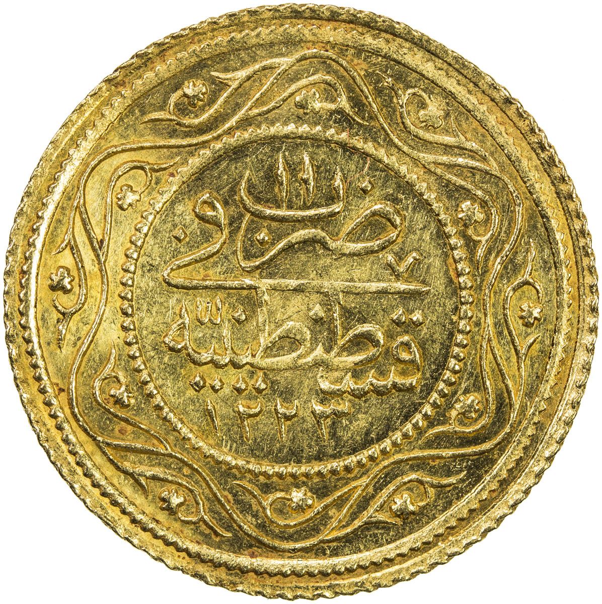 TURKEY: Mahmud II, 1808-1839, AV 2 rumi altin (4.77g), Kostantiniye, AH1223 year 11, KM-614, slightly uneven, Unc, ex Ahmed Sultan Collection.