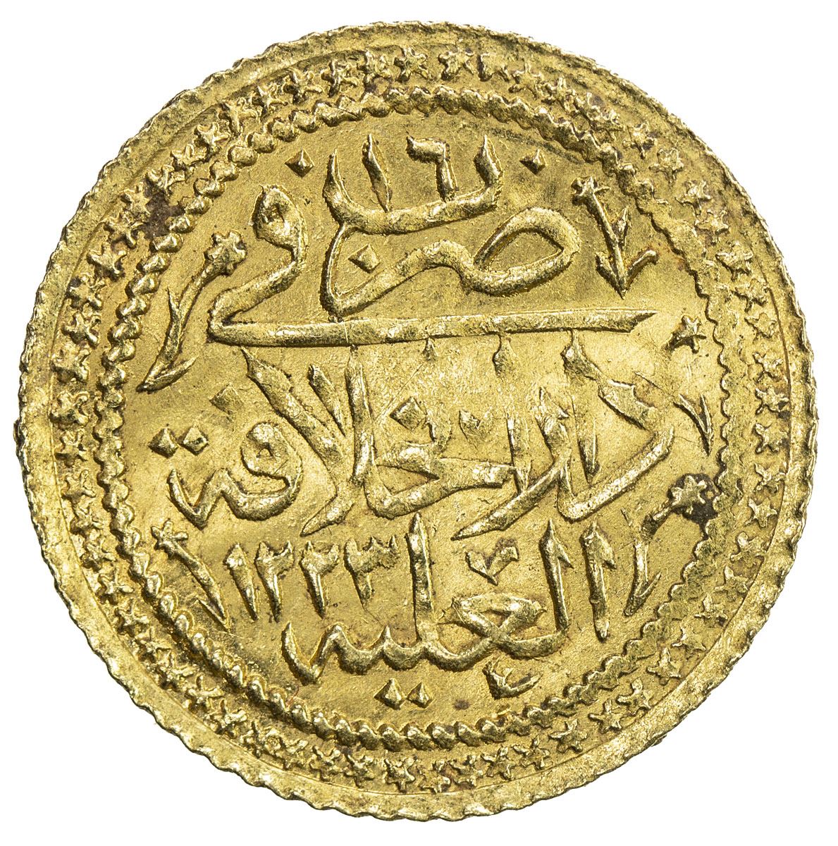 TURKEY: Mahmud II, 1808-1839, AV sûrre altin al-aliye (1.60g), Darulhalife, AH1223 year 16, KM-621, EF, ex Ahmed Sultan Collection.