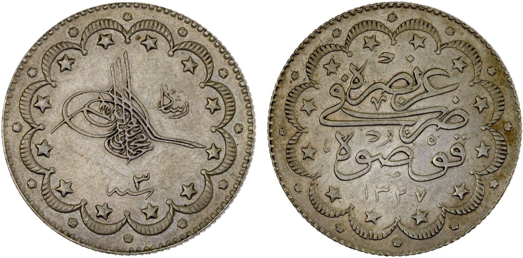 TURKEY: Mehmet V, 1909-1918, AR 10 kurush, Kosova, AH1327 year 3, XF