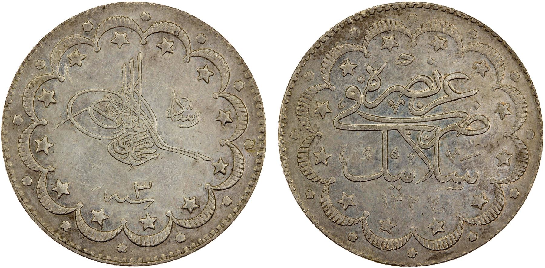 TURKEY: Mehmet V, 1909-1918, AR 10 kurush, Salonika, AH1327 year 3, XF