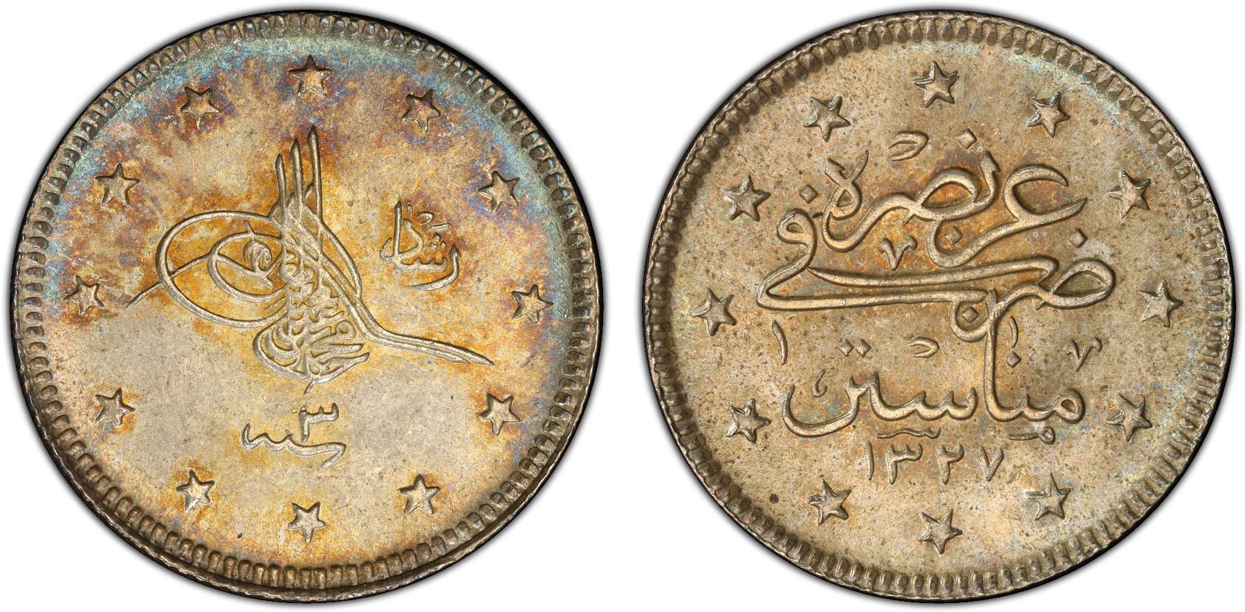 TURKEY: Mehmet V, 1909-1918, AR 2 kurush, Manastir, AH1327 year 3, PCGS MS65