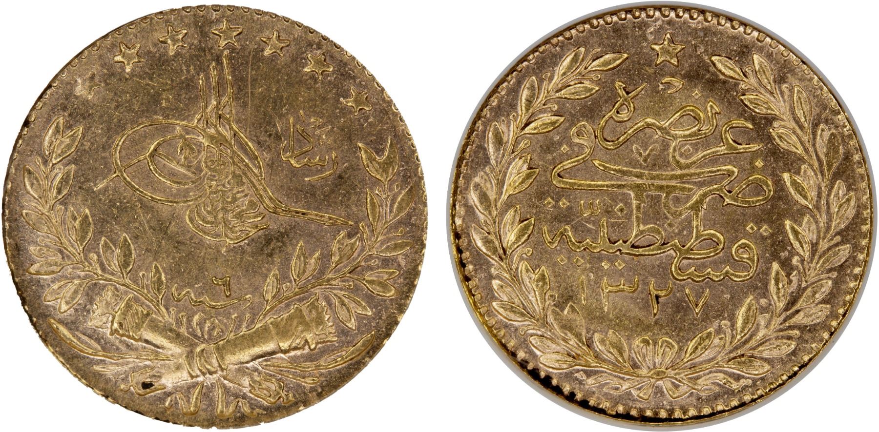 TURKEY: Mehmet V, 1909-1918, AV 25 kurush, AH1327 year 6, NGC MS63