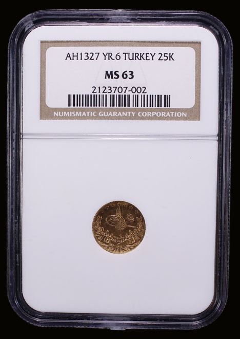 TURKEY: Mehmet V, 1909-1918, AV 25 kurush, AH1327 year 6, KM-752, Fr-157, brilliant frosty luster, with "Reshat", NGC graded MS63, ex The 1914 Collection.