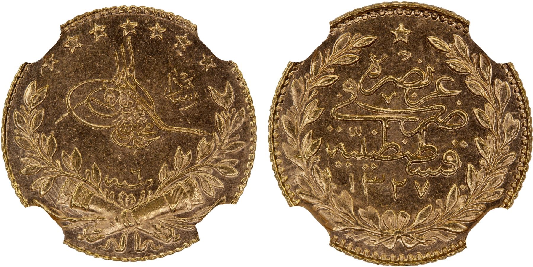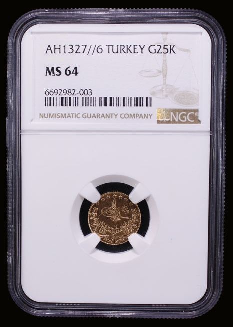 TURKEY: Mehmet V, 1909-1918, AV 25 kurush, AH1327 year 6, KM-752, Fr-157, very lustrous, with "Reshat", NGC graded MS64, ex The 1914 Collection. Second finest graded by both NGC and PCGS.