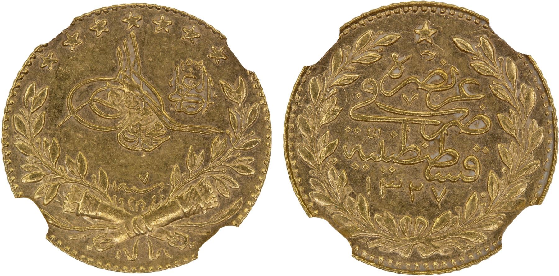 TURKEY: Mehmet V, 1909-1918, AV 25 kurush, AH1327 year 7, KM-752, Fr-162, lustrous, with "el-Ghazi", NGC graded MS62, ex The 1914 Collection. Finest graded by both NGC and PCGS.
