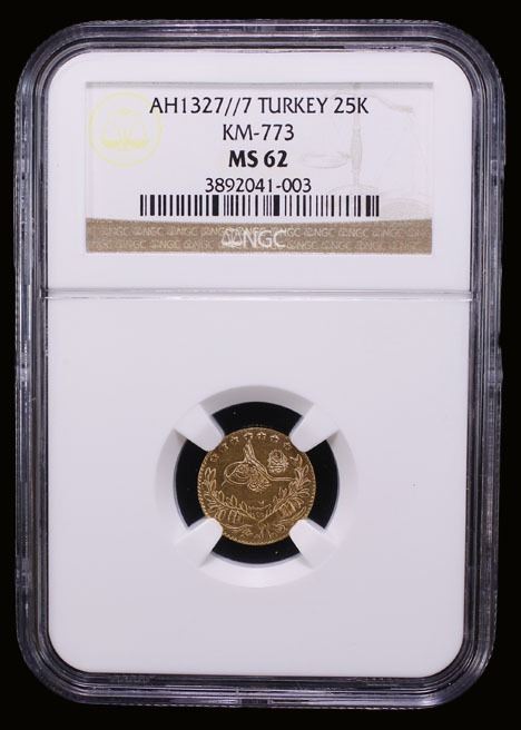 TURKEY: Mehmet V, 1909-1918, AV 25 kurush, AH1327 year 7, NGC MS62