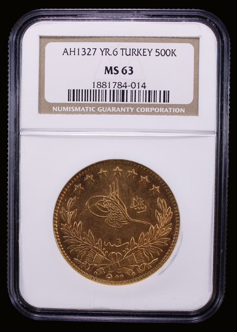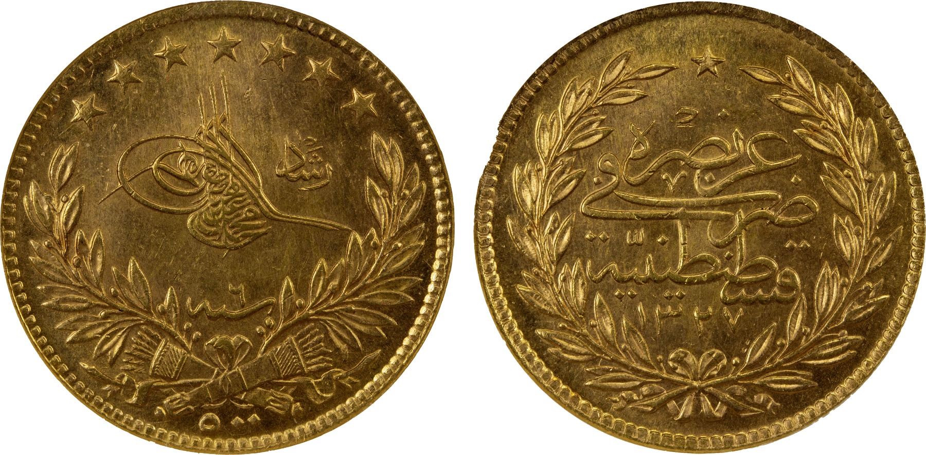 TURKEY: Mehmet V, 1909-1918, AV 500 kurush, AH1327 year 6, KM-758, Fr-152, lustrous, with beautiful orange coloration, with "Reshat", NGC graded MS63, ex The 1914 Collection. Finest graded by both NGC and PCGS.