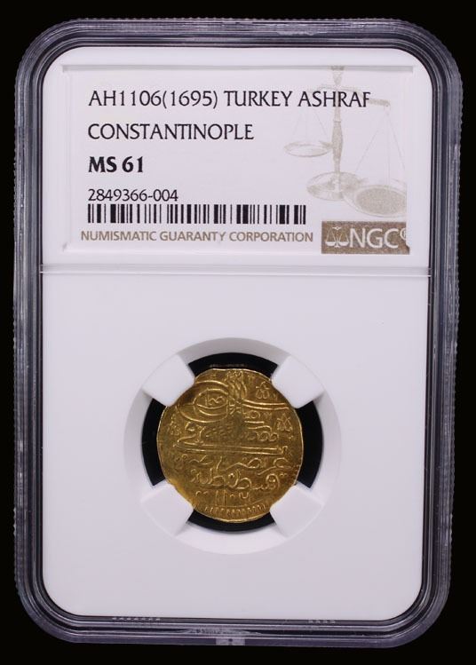 TURKEY: Mustafa II, 1695-1703, AV sultani (ashrafi), Kostantiniye, AH1106, KM-127, UBK-13, NGC graded MS61.