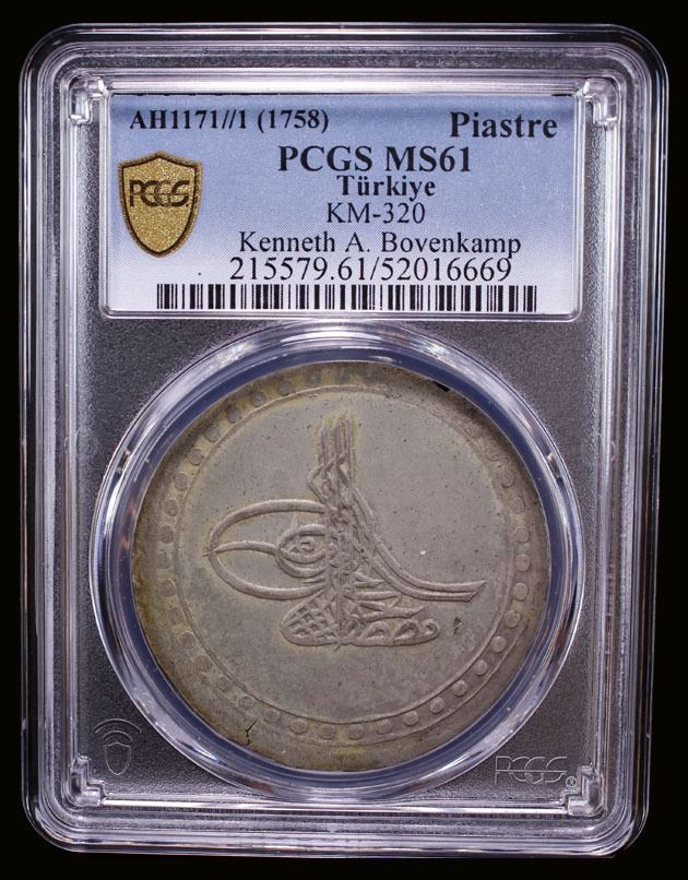 TURKEY: Mustafa III, 1757-1774, AR kurush, Islambul, AH1171 year 1, KM-320, without rosette right of toughra, a pleasant mint state example, PCGS graded MS61, ex Kenneth A. Bovenkamp Collection.
