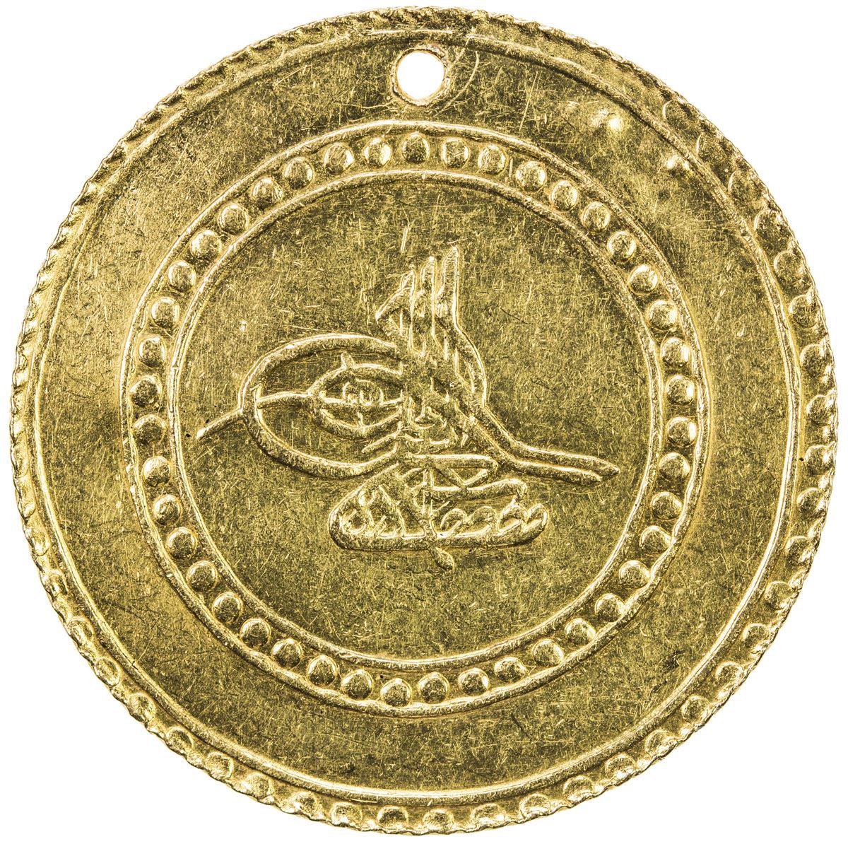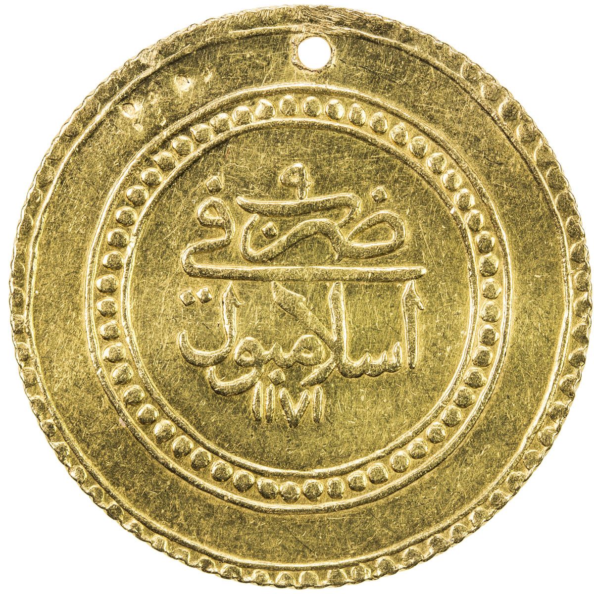 TURKEY: Mustafa III, 1757-1774, AV 2½ altin (8.91g), Islambul, AH1171 year 9, KM-350, pierced, 2 dings on reverse, bold strike, EF, ex Ahmed Sultan Collection. The denomination has been corrected by Damali, who reports year 7, 8, 9, and 11 for this denomination.