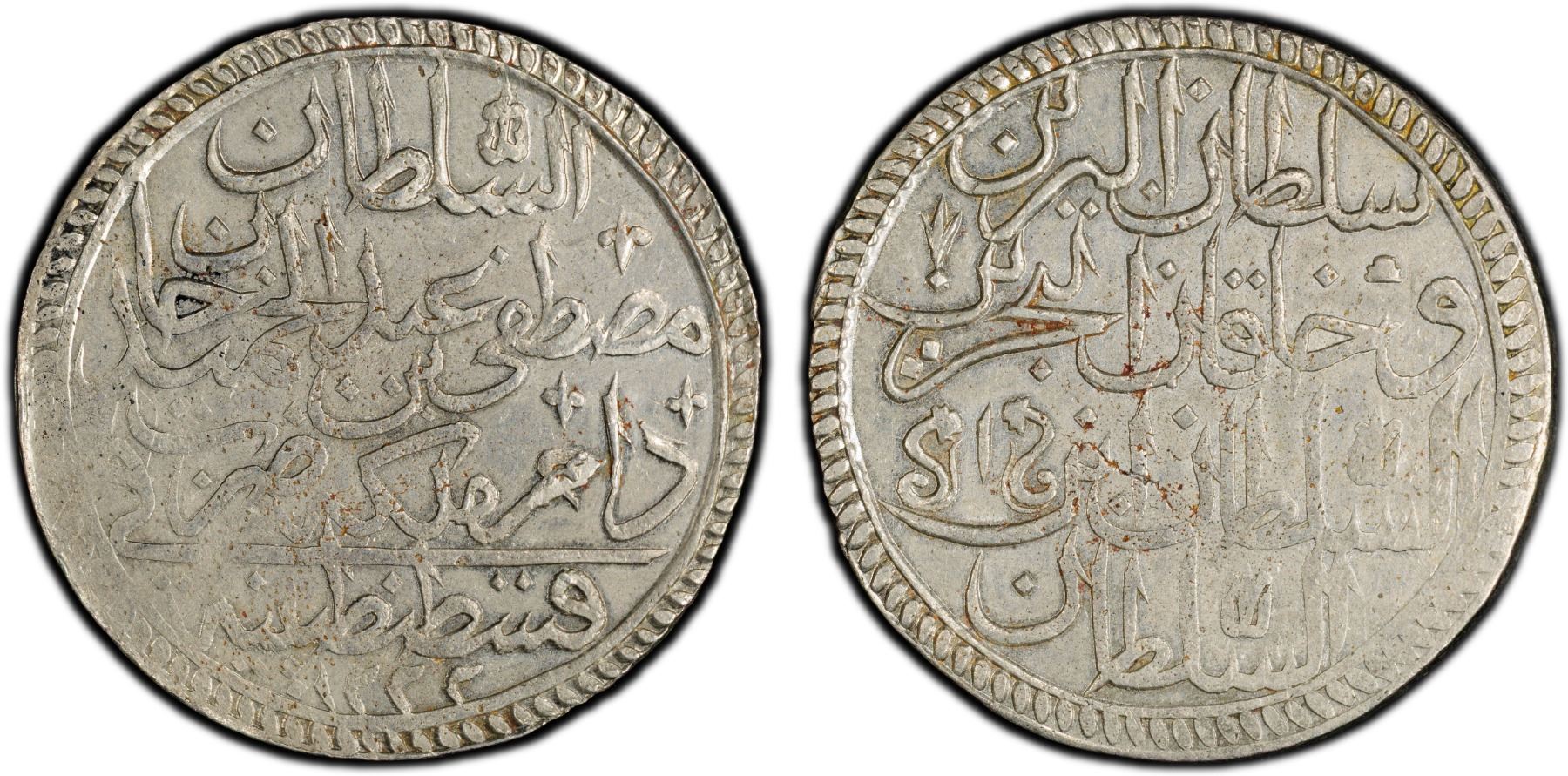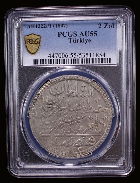 TURKEY: Mustafa IV, 1807-1808, AR altmislik / 2 zolota, Kostantiniye, AH1222 year 1, KM-540.2, a lustrous example! PCGS graded AU55, ex Kenneth A. Bovenkamp Collection, ex Roma Numismatics Electronic Sale 77, Lot 555.
