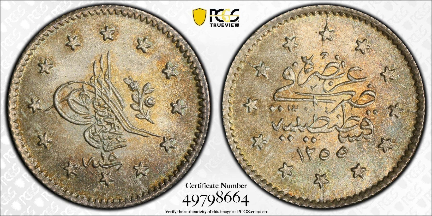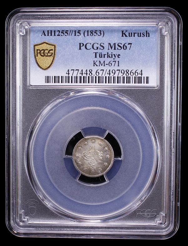 TURKEY: Abdul Mejid, 1839-1861, AR kurush, Kostantiniye, AH1255 year 15 (1853), KM-671, a stunning reflective mint state example! PCGS graded MS67. Part of a small group of 15 coins of this accessional date and regnal year purchased by Maj. Fred S. Pridmore in Cyprus in the 1960s.