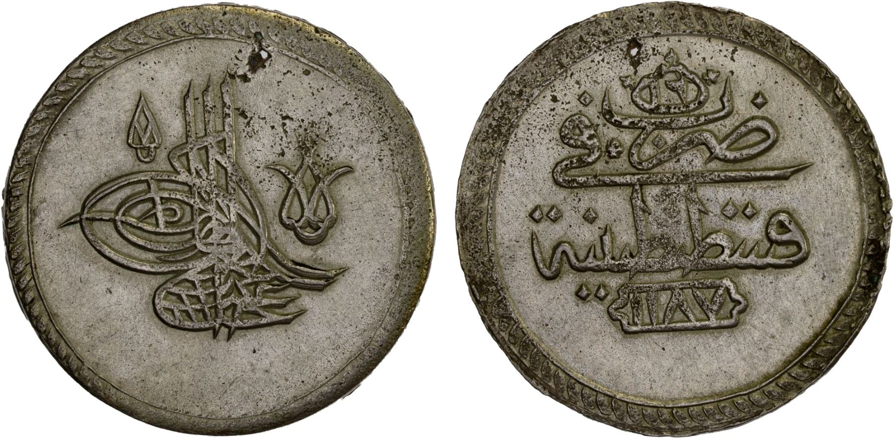 TURKEY: Abdul Hamid I, 1774-1789, AR 2 piastres (29.89g), Kostantiniye, AH1187 year 16, KM-406, scarce one-year type, pierced, light cleaning, XF-AU.