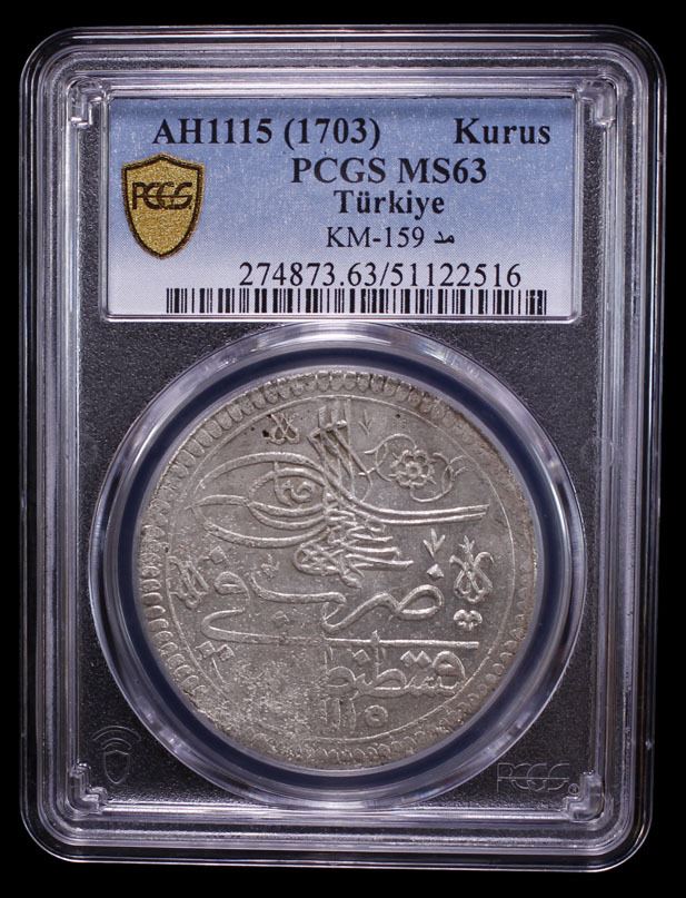 TURKEY: Ahmed III, 1703-1730, AR kurush, Kostantiniye, AH1115, KM-159, mint master initials mim dal, a lovely lustrous mint state example! PCGS graded MS63.