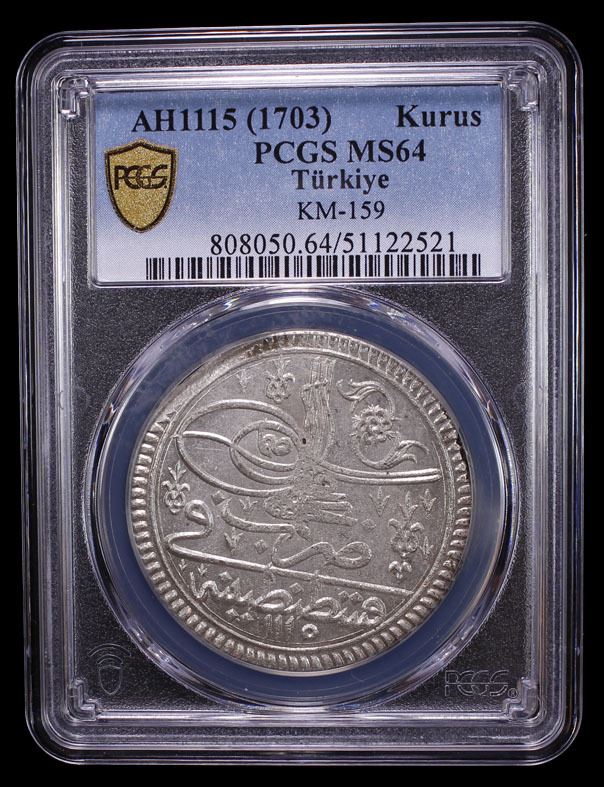 TURKEY: Ahmed III, 1703-1730, AR kurush, Kostantiniye, AH1115, KM-159, mint master initials mim, a wonderful lustrous mint state example! PCGS graded MS64.
