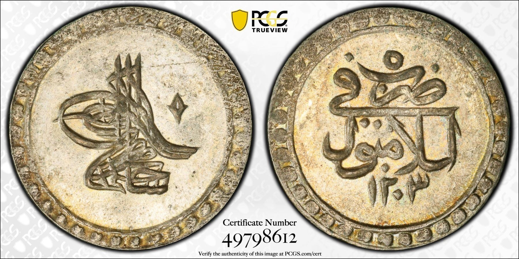 TURKEY: Selim III, 1789-1807, AR 10 para, Islambul, AH1203 year 5 (1793), KM-492, a wonderful lustrous mint state example! PCGS graded MS64. Part of a small group of 38 coins of this accessional date and regnal year purchased by Maj. Fred S. Pridmore in Cyprus in the 1960s.