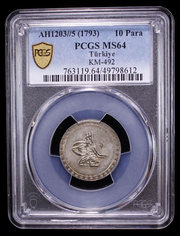 TURKEY (OTTOMAN EMPIRE): Selim III, 1789-1807, AR 10 para, Islambul, AH1203 year 5 (1793), PCGS MS64