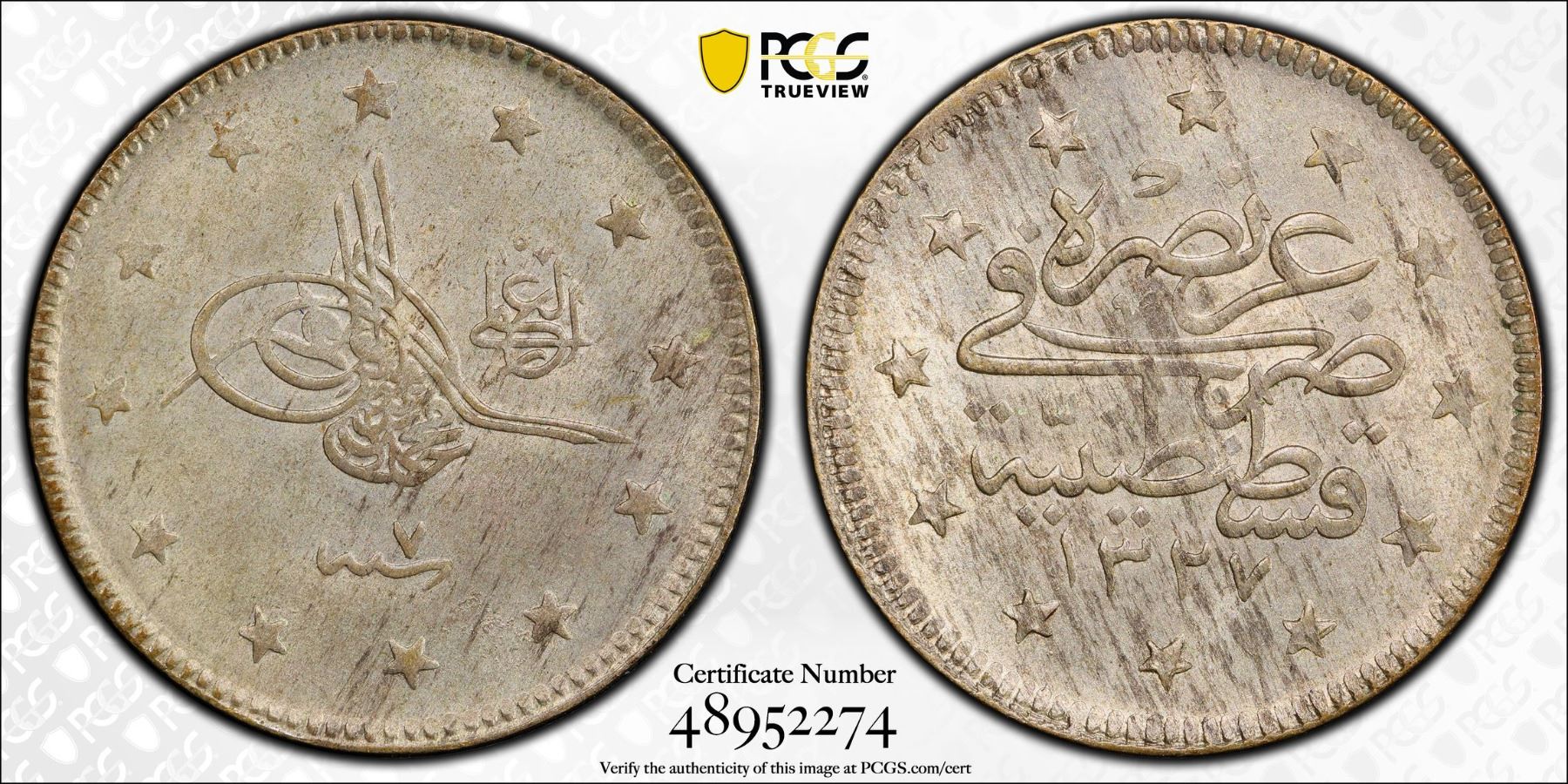 TURKEY (OTTOMAN): Mehmet V, 1909-1918, AR 2 kurush, Kostantiniye, AH1327 year 7, PCGS MS63