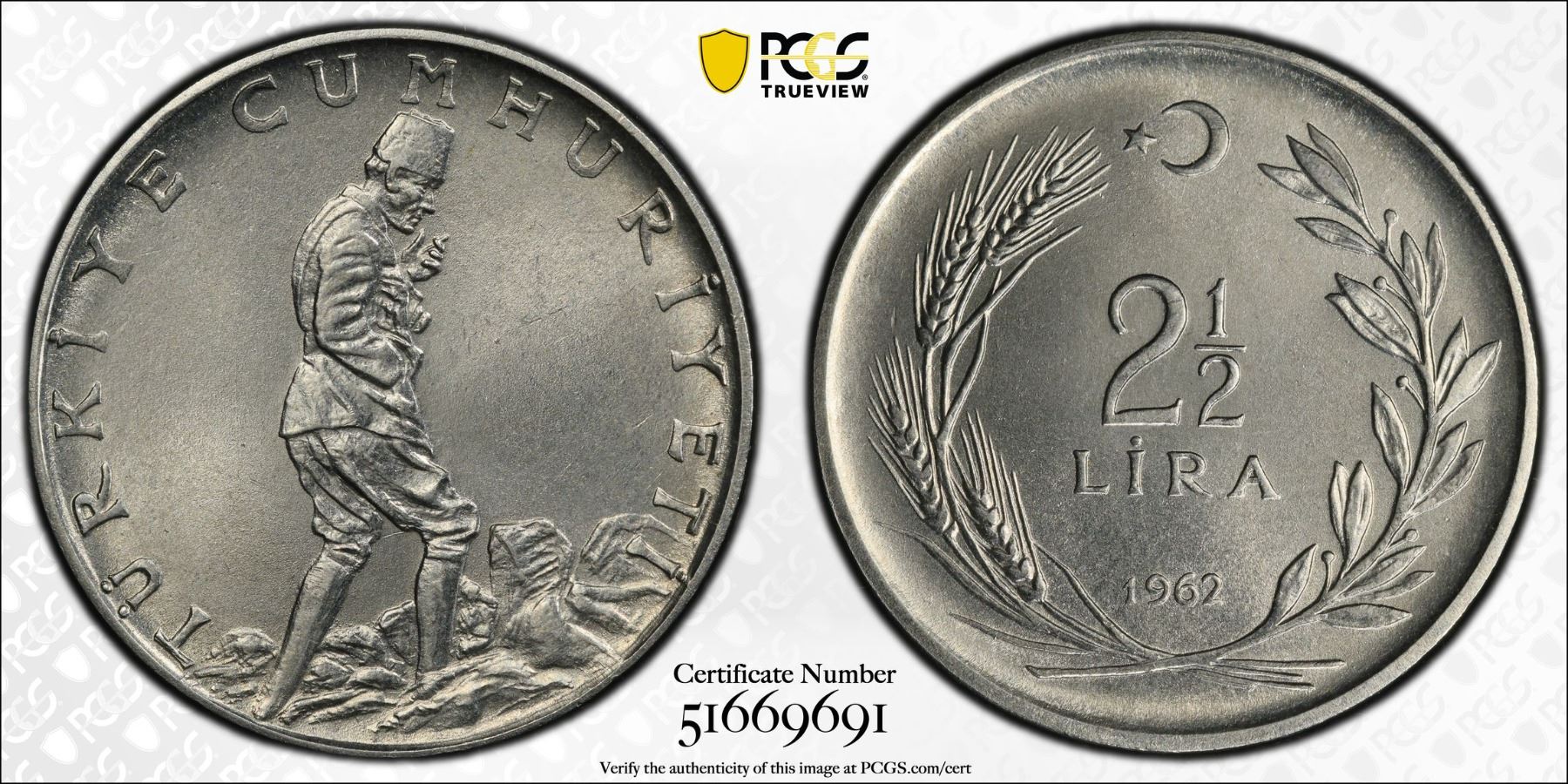 TURKEY: Republic, 2½ lira, 1962, KM-893.1, scarce date, a fantastic lustrous example! PCGS graded MS66.