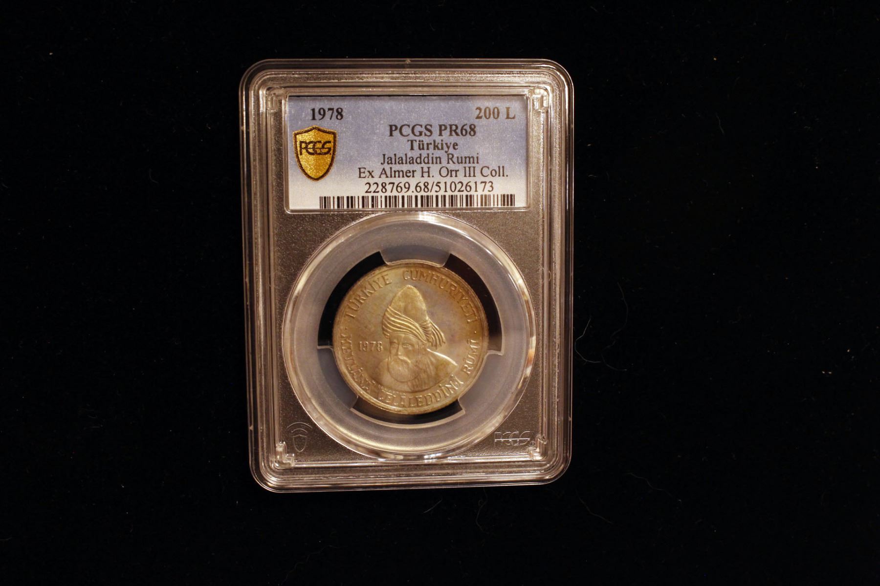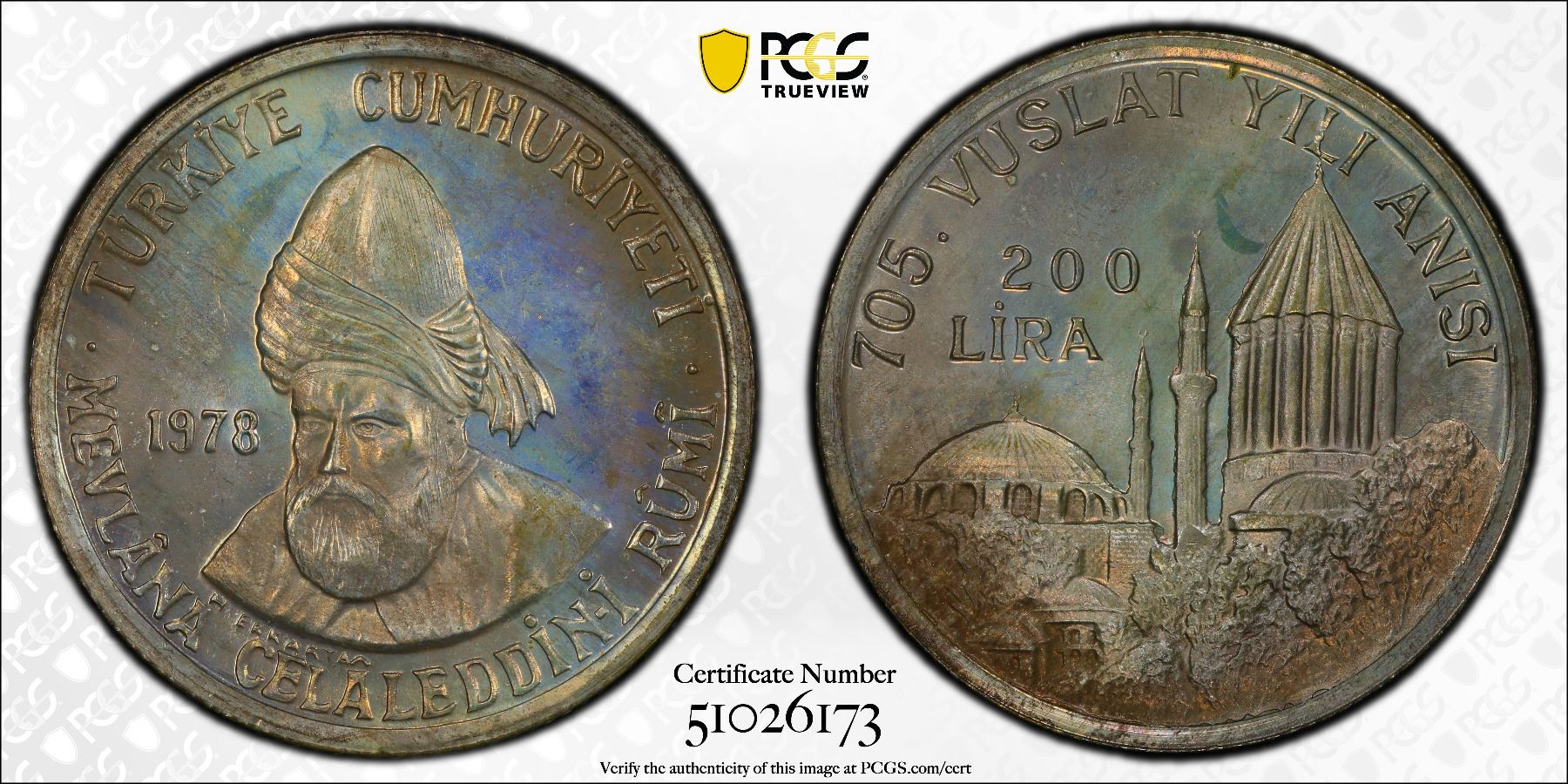 TURKEY: Republic, AR 200 lira, 1978, KM-919, Y-186, 705th Anniversary - Death of Jalaladdin Rumi, Poet, a spectacular example, PCGS graded Proof 68, ex Almer H. Orr III Collection.