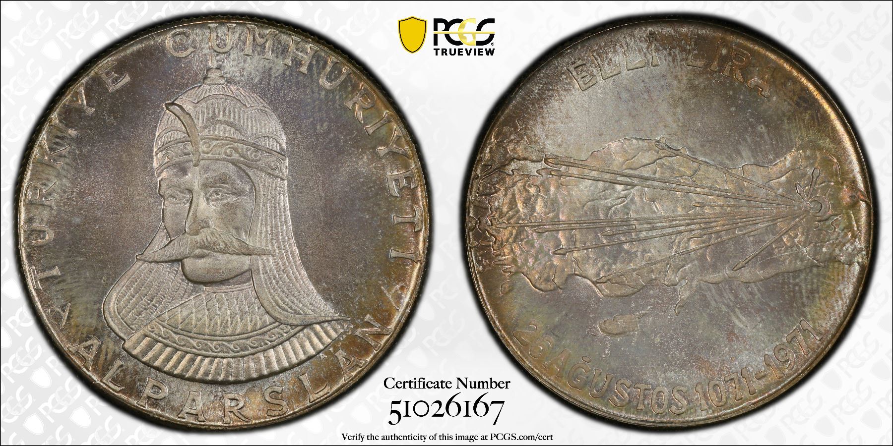 TURKEY: Republic, AR 50 lira, 1971, KM-900, Y-167, 900th Anniversary of the Battle of Malazgirt, a spectacular example, PCGS graded MS68, ex Almer H. Orr III Collection.
