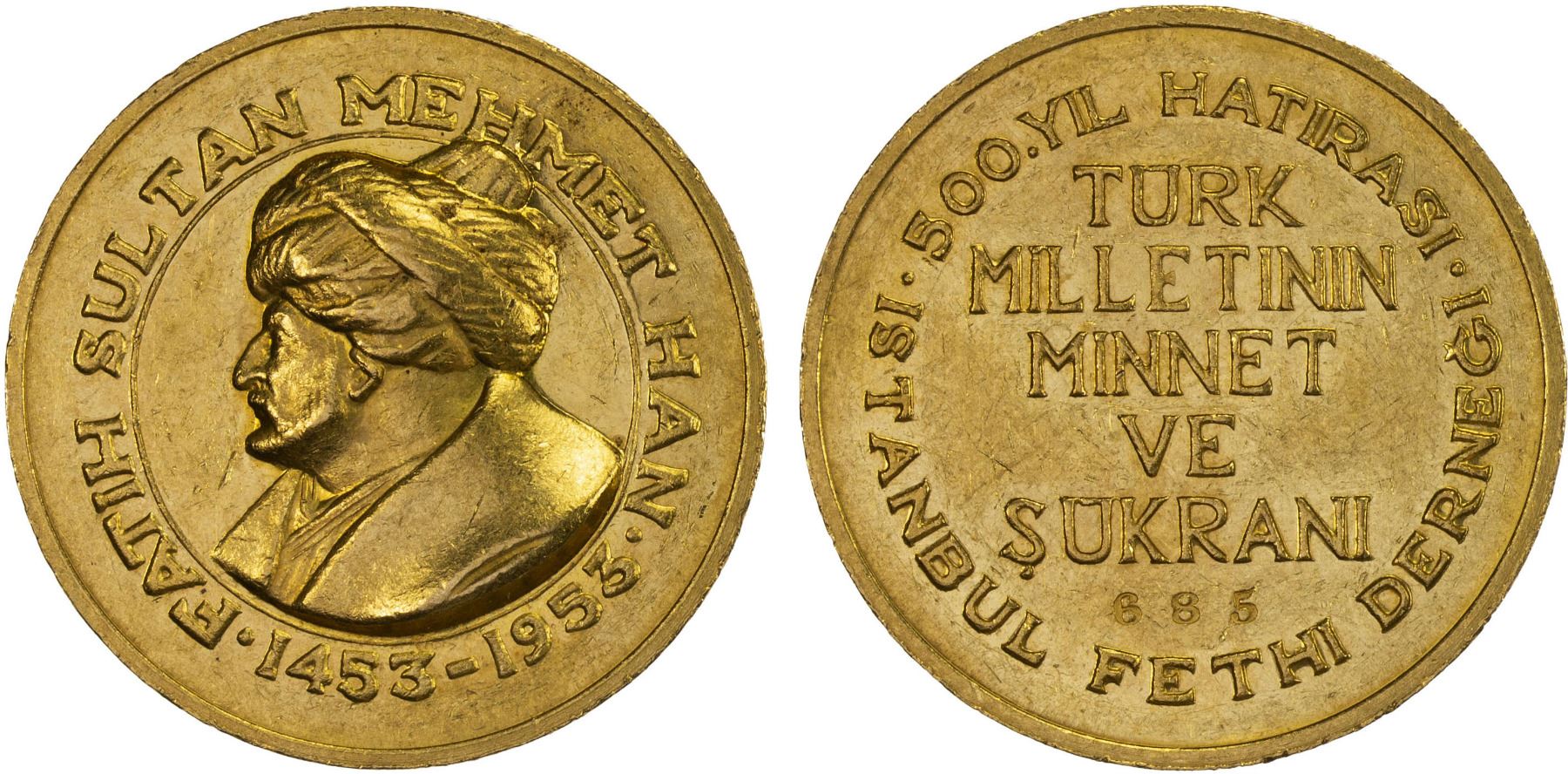 TURKEY: Republic, AV medal (15.99g), 1953, DAR-1379, 27mm unsigned .900 fine gold medal for the 500th Anniversary of the Conquest of Constantinople, bust in turban left with FATIH SULTAN MEHMET HAN - 1453-1953 around // TURK / MILLETININ / MINNET / VE / SUKRANI with incuse serial number "685" below and "500 YIL HATIRASI - ISTANBUL FETHI DERNEGI around, plain edge, Choice XF.