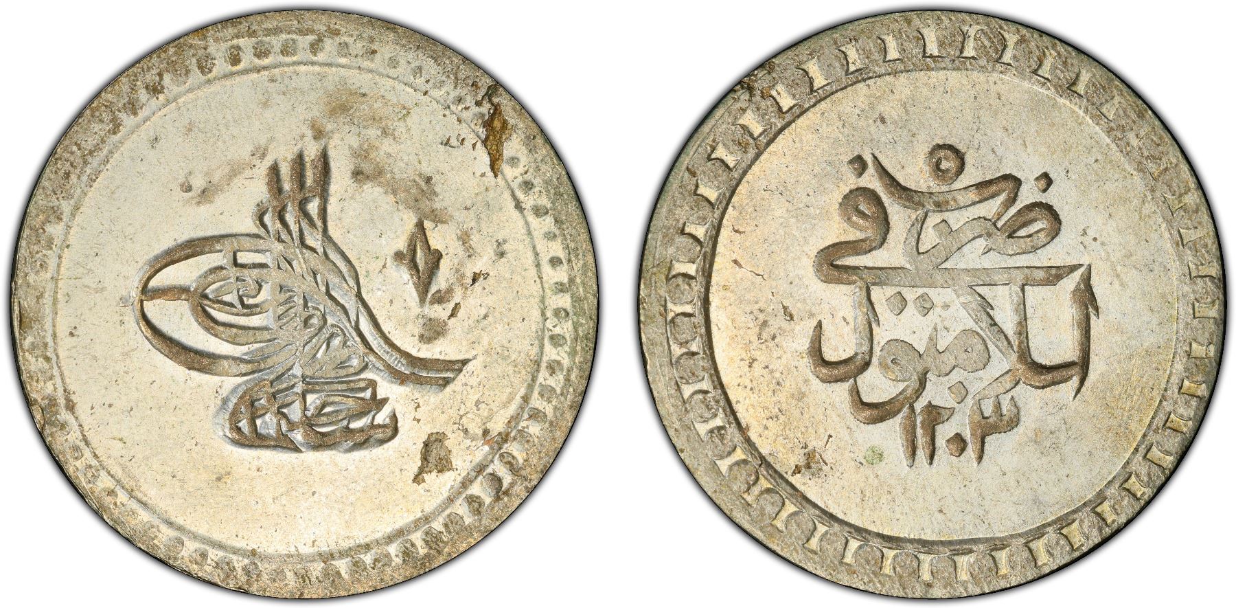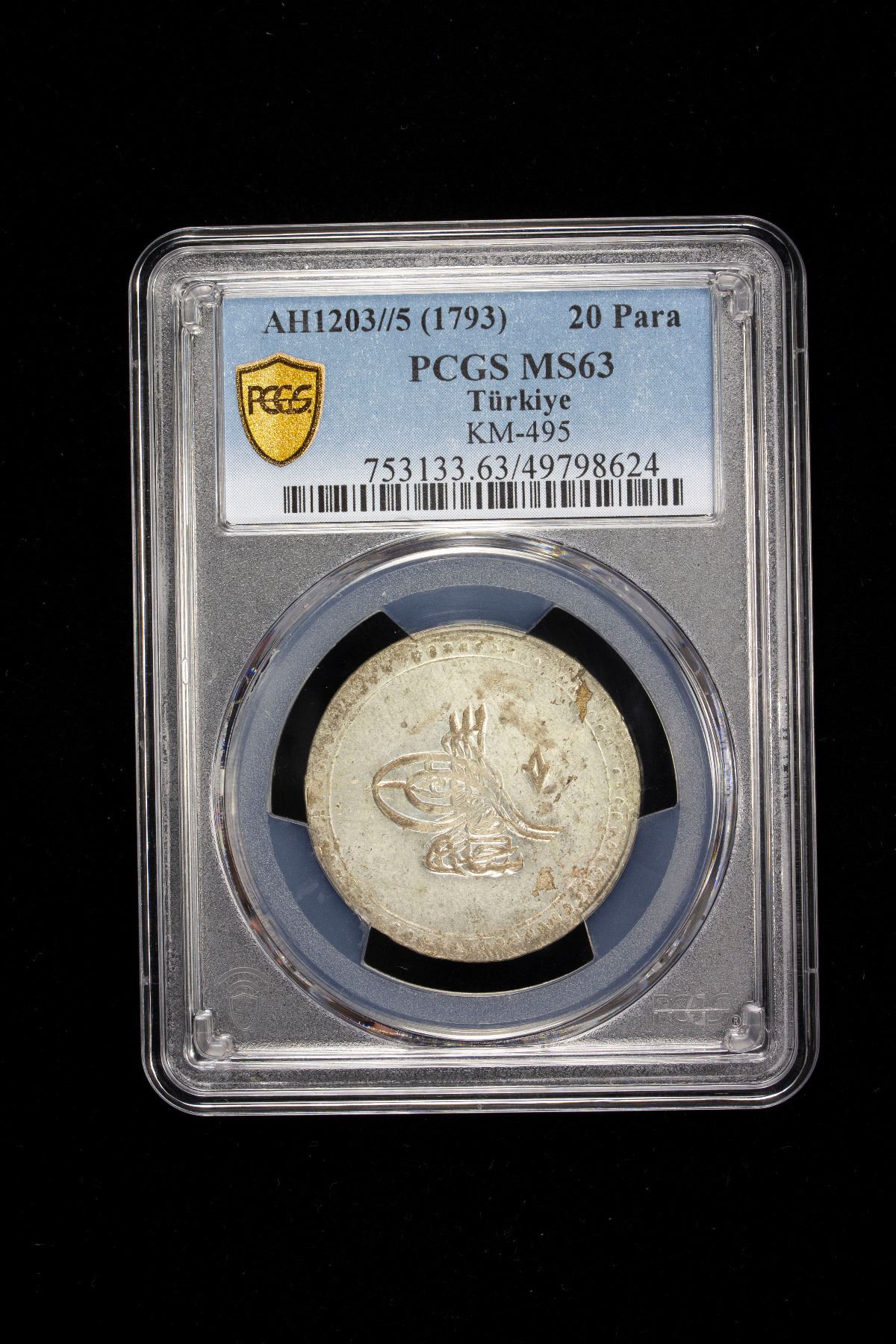 TURKEY: Selim III, 1789-1807, AR 20 para, Islambul, AH1203 year 5 (1793), KM-495, a lovely lustrous mint state example! PCGS graded MS63. Part of a small group of 7 coins of this accessional date and regnal year purchased by Maj. Fred S. Pridmore in Cyprus in the 1960s.