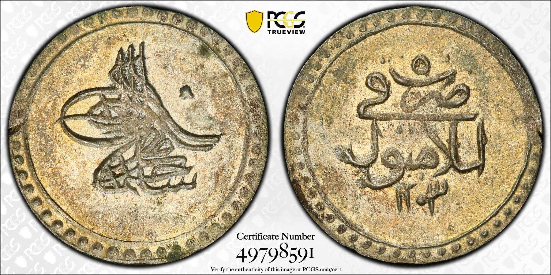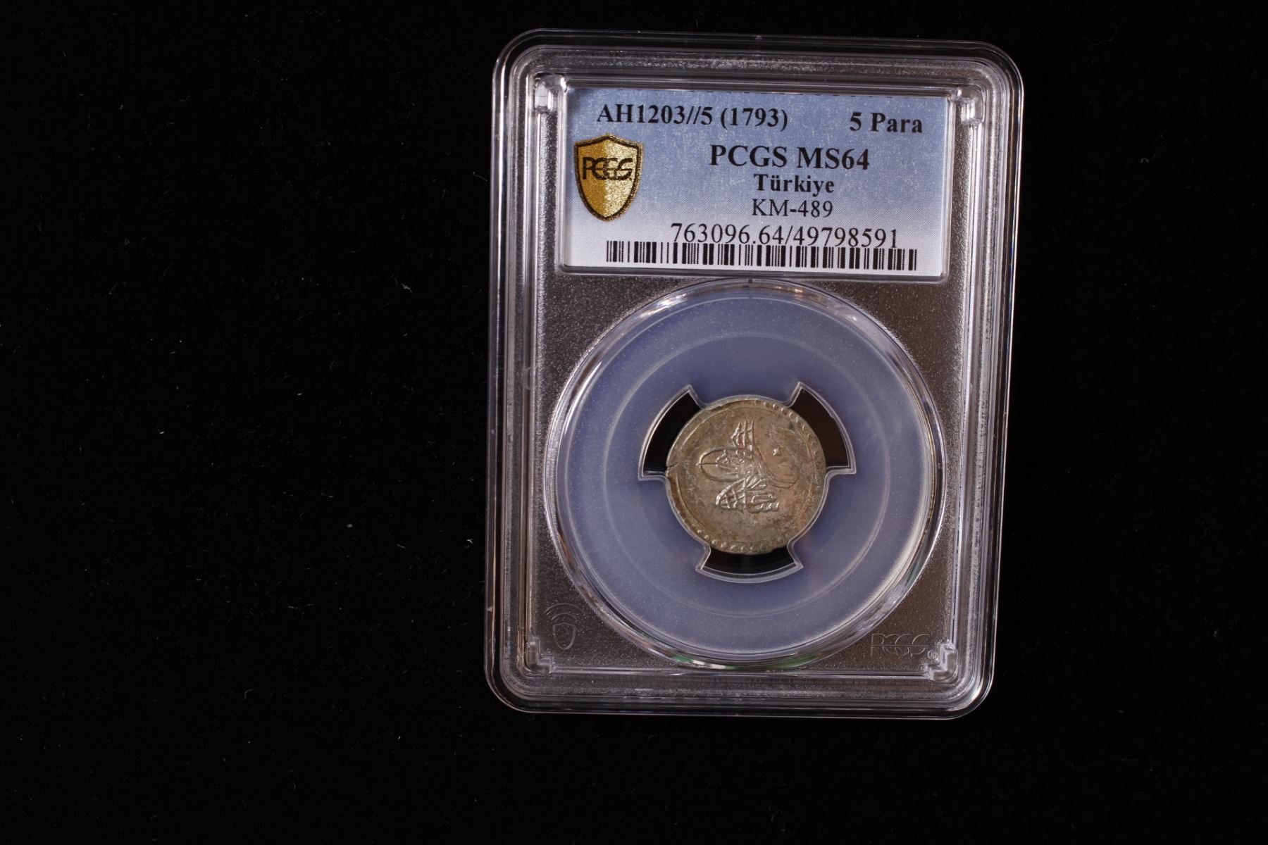 TURKEY: Selim III, 1789-1807, AR 5 para, Islambul, AH1203 year 5 (1793), KM-489, a wonderful lustrous mint state example! PCGS graded MS64. Part of a small group of 18 coins of this accessional date and regnal year purchased by Maj. Fred S. Pridmore in Cyprus in the 1960s.