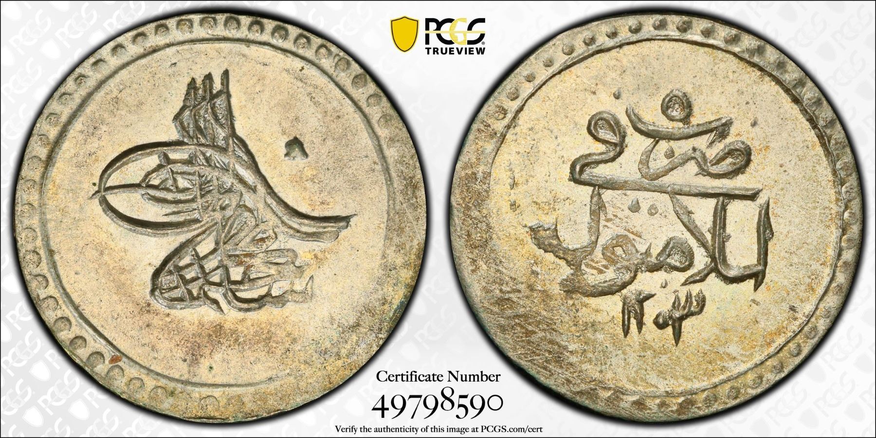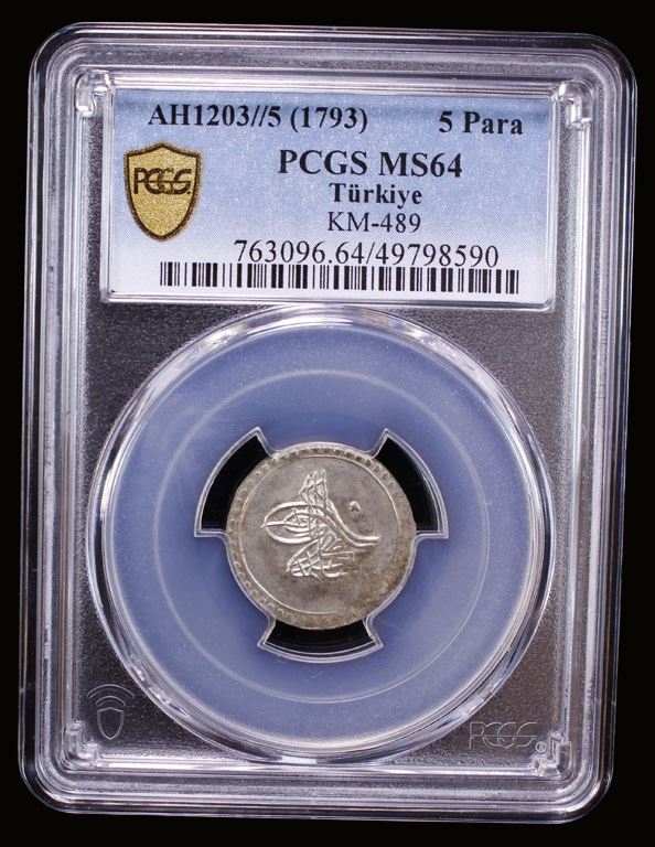 TURKEY: Selim III, 1789-1807, AR 5 para, Islambul, AH1203 year 5 (1793), KM-489, a wonderful lustrous mint state example! PCGS graded MS64. Part of a small group of 18 coins of this accessional date and regnal year purchased by Maj. Fred S. Pridmore in Cyprus in the 1960s.