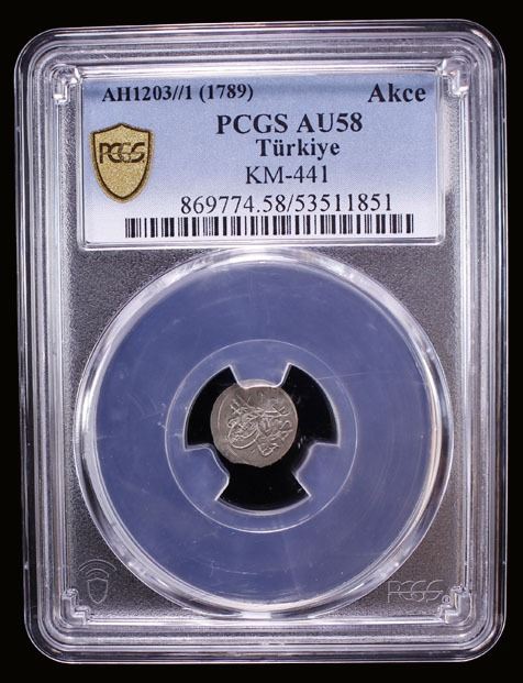 TURKEY: Selim III, 1789-1807, AR akçe (0.09g), Islambul, AH1203 year 1, KM-441, First tughra type with khan below selim, an attractive nearly mint state example, PCGS graded AU58, ex Kenneth A. Bovenkamp Collection, ex Stephen Album Auction 3, Lot 170.