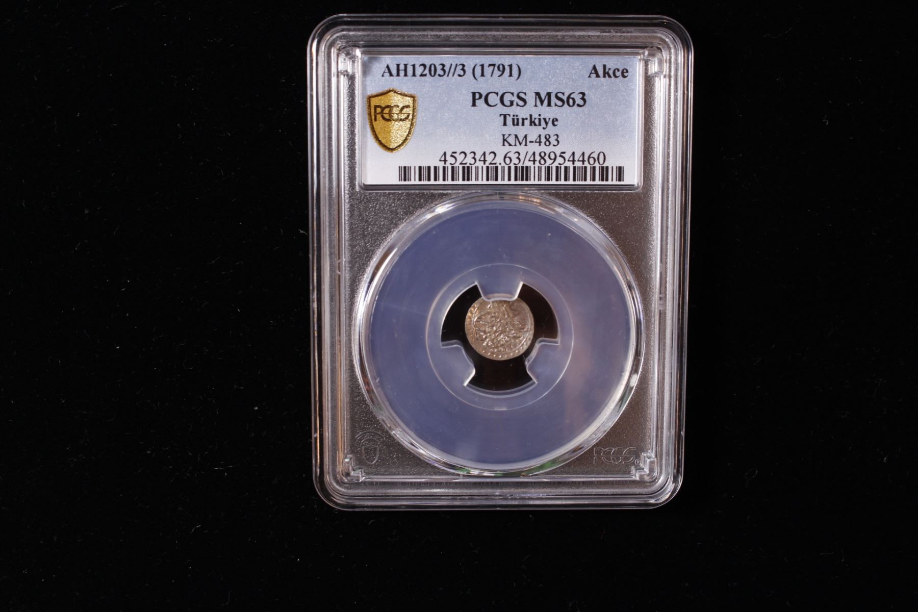 TURKEY: Selim III, 1789-1807, AR akçe, Islambul, AH1203 year 3, KM-483, a lovely lustrous mint state example! PCGS graded MS63. Usual partial brockage or 'ghosting' error of obverse due to the thin planchets used for this denomination.
