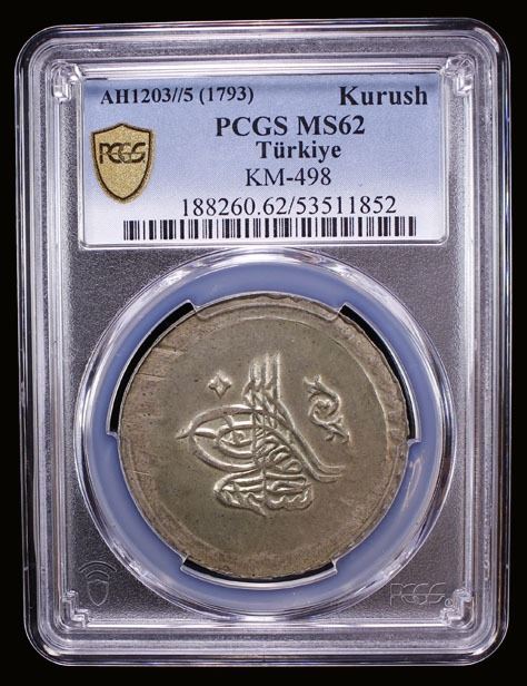 TURKEY: Selim III, 1789-1807, AR kurush, Islambul, AH1203 year 5, KM-498, First tughra type with khan below selim, a pleasing mint state example, PCGS graded MS62, ex Kenneth A. Bovenkamp Collection.